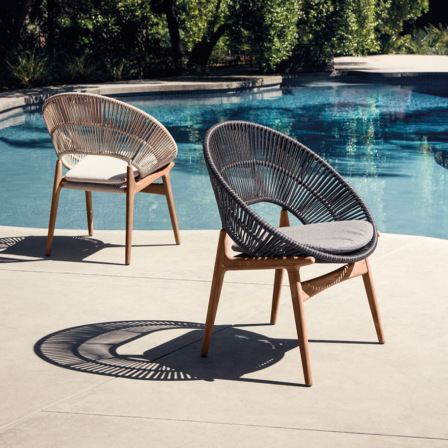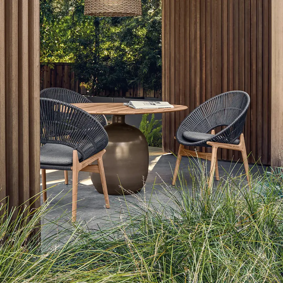 The Bora Dining Chair pairs a natural teak frame with gently curved seat and back panels in woven all-weather wicker. The multicoloured weave adds depth and texture, while the rounded form offers a comfortable, supportive sit. Crafted for durability and style, it’s a versatile addition to any outdoor dining setting.