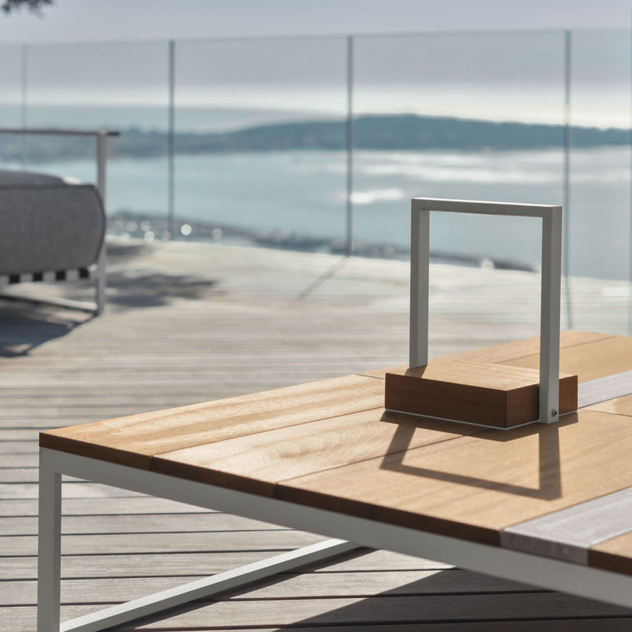 The Casilda Lamp stands out for its ability to merge architectural elegance with outdoor-ready functionality in a way few lighting pieces achieve. Designed by Ramón Esteve, it's available in three sizes, working equally well as a tabletop accent, a freestanding floor light, or a dramatic full-height feature. Its defining feature is the minimalist stainless-steel frame, which appears almost weightless yet encloses a solid iroko or Accoya wood base, giving it a tactile, organic counterpoint. The integrated LED modules, with their warm 2800 K glow, are tailored to create a soft, atmospheric light rather than a harsh beam, making it perfect for mood lighting. The smaller versions are battery-powered and fully portable, while the larger L version offers wired stability for extended use, giving flexibility depending on how and where it’s placed.