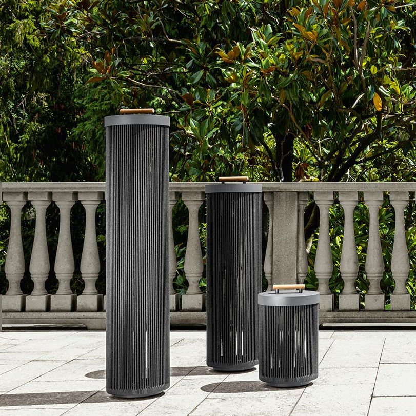 The Coral Lamp, designed by Marco Acerbis, is available in three sizes, offering versatile illumination options to suit various spaces. The lamp features a cylindrical aluminium frame, powder-coated to ensure durability and resistance to the elements. Its surface is adorned with handwoven synthetic rope, a signature detail that imparts a sense of lightness and texture. Atop the frame, a teak wood handle adds a touch of warmth and functionality, facilitating easy relocation. The lamp is equipped with a 7W LED light source emitting a 2800K warm white glow, creating an inviting ambiance for evening gatherings. The Coral Lamp is battery-operated, eliminating the need for external wiring and offering flexibility in placement. Its IP44 rating ensures protection against water splashes, making it suitable for various outdoor environments.