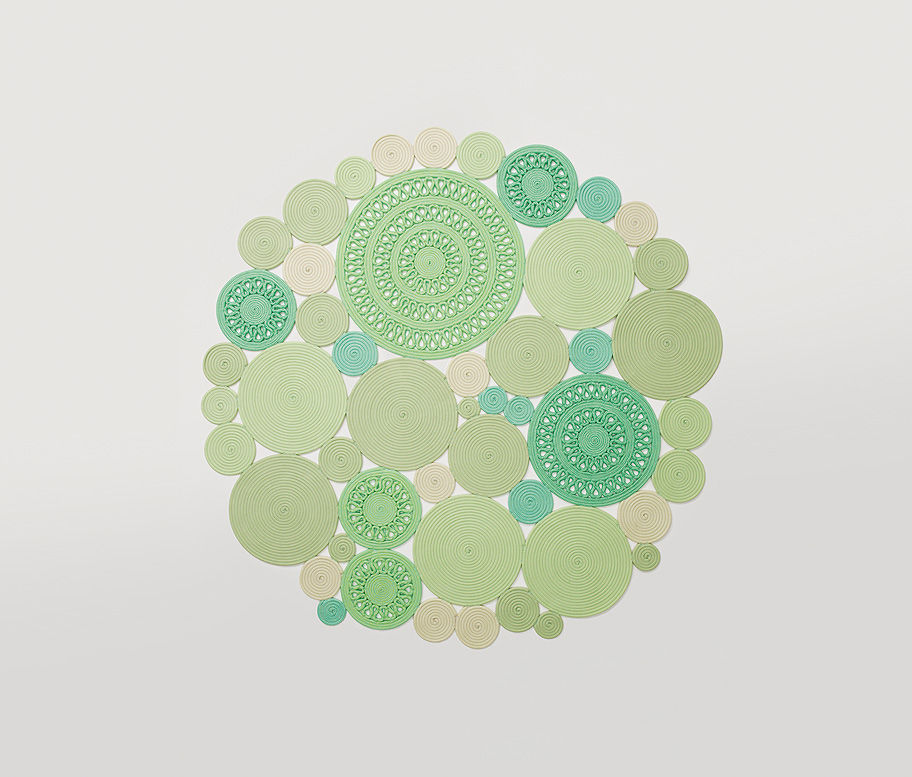 The Cosmo Rug is a poetic assembly of hand-crafted artistry and sculptural lightness, uniquely designed for sheltered outdoor spaces. Its surface is composed of individual Rope Corda modules, each hand-sewn from high-performance polyolefin cord, and arranged in varied dimensions and techniques. Some modules feature spiral-stitched patterns, while others form intricately shaped circular motifs. These pieces are then meticulously stitched together using matching yarn, creating an organic network with delicate gaps that allow glimpses of the floor beneath, lending the design an airy, rhythmic presence.