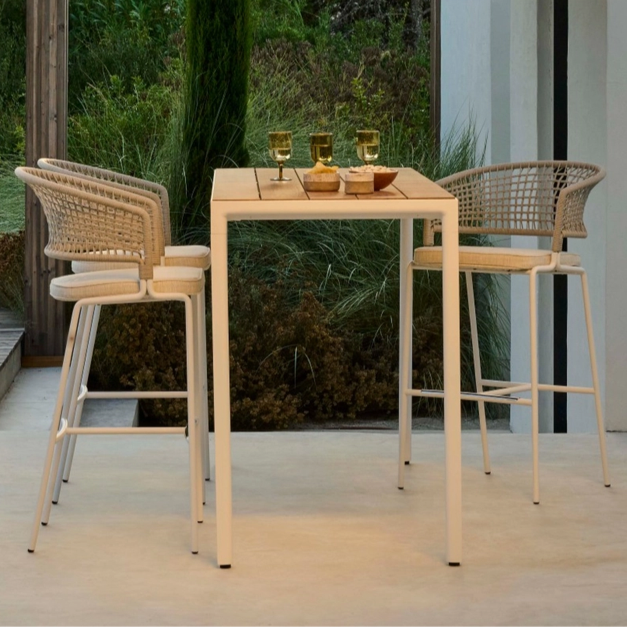 Designed by Piergiorgio Cazzaniga, the CTR Bar Chair features a continuous stainless steel tubular frame, powder‑coated, and seamlessly bent into crisp 90° folds while maintaining round, fluid geometry. The openwork backrest, crafted from Tricord®, floats nearly suspended above the seat, offering breathable support and visual softness. This innovative fiber provides UV-, rot-, and mildew-resistance while delivering a soft, natural weave. A removable, water-repellent seat cushion comfort.