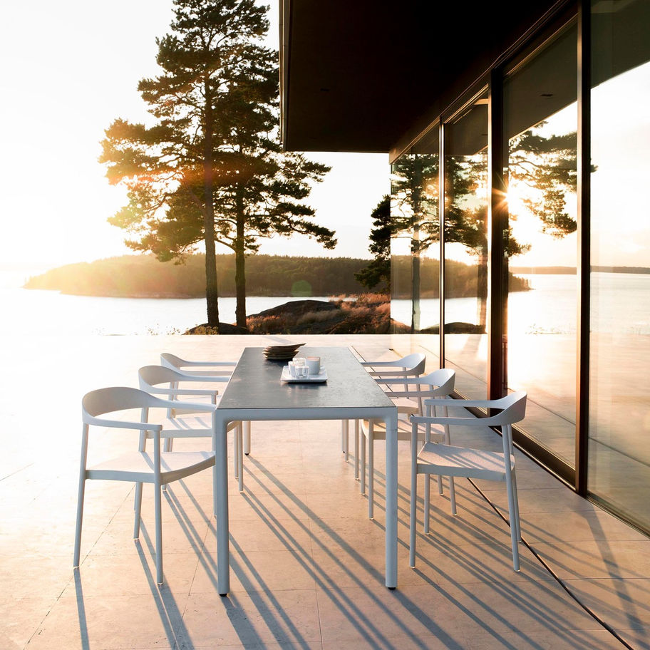 The simplest designs are often the most elegant ones. The Illum table is kept pure and simple with beautifully curved profiles complementing the slim legs. The tabletop is available in teak or ceramics in various colours. The table comes in two widths: the standard 98cm and a more narrow version of 71cm. The latter is not only the ideal solution for more narrow patios and balconies, but also makes the perfect companion for casual dining.
