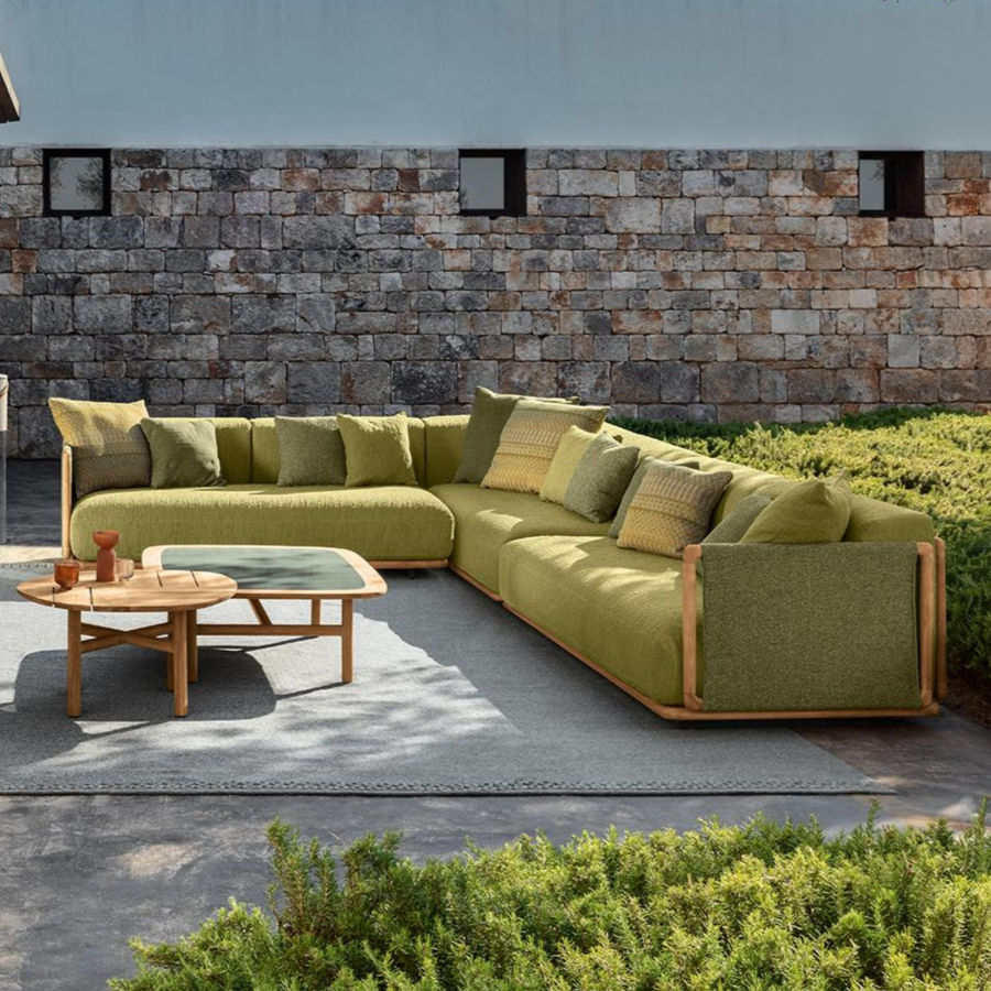 The Jun Modular Sofa offers incomparable versatility, combining modular elements to match any space and style. The solid and natural structure welcomes soft seats in bouclé fabric, completely removable, giving the sofa a modern and cosy elegance. The modules are easily combined, allowing for customised configurations, while the lifted legs add a touch of lightness. Perfect for dynamic and sophisticated outdoor environments, the Jun Modular Sofa is an ideal solution for living moments of relaxation in absolute style.