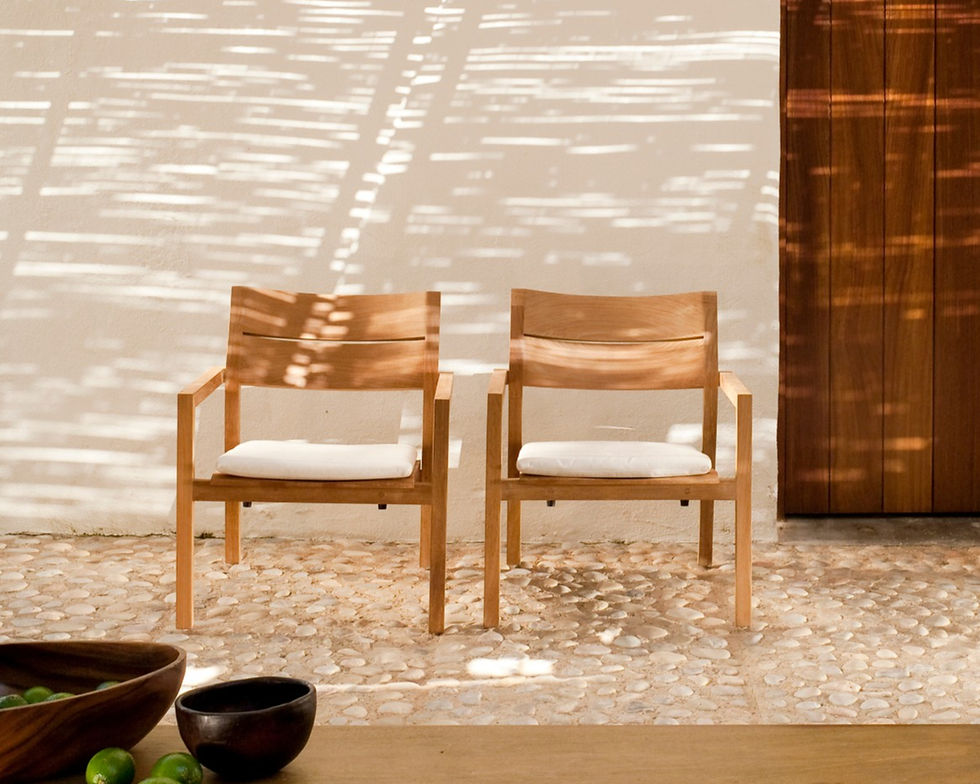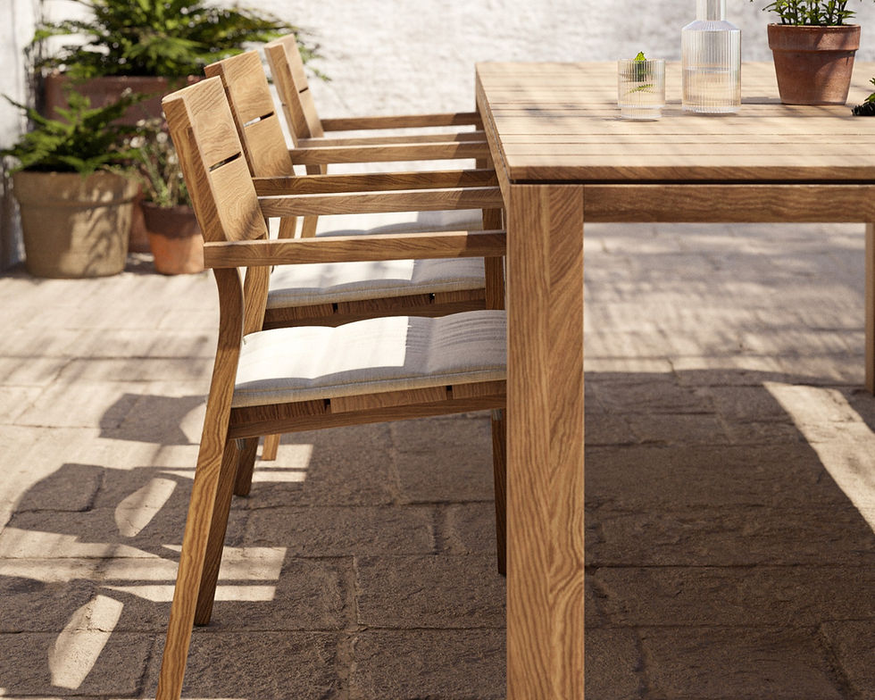 The Kos Bar Chair is composed entirely of premium East-Java plantation teak. The chair’s broad, solid slats create a bold yet harmonious silhouette; a powerful reinterpretation of traditional teak seating with everyday comfort in mind. Without the need for cushions, the ergonomics are refined: the wooden slats are gently contoured for natural seating comfort, and optional seat cushions customize softness with weather-resistant fabrics.