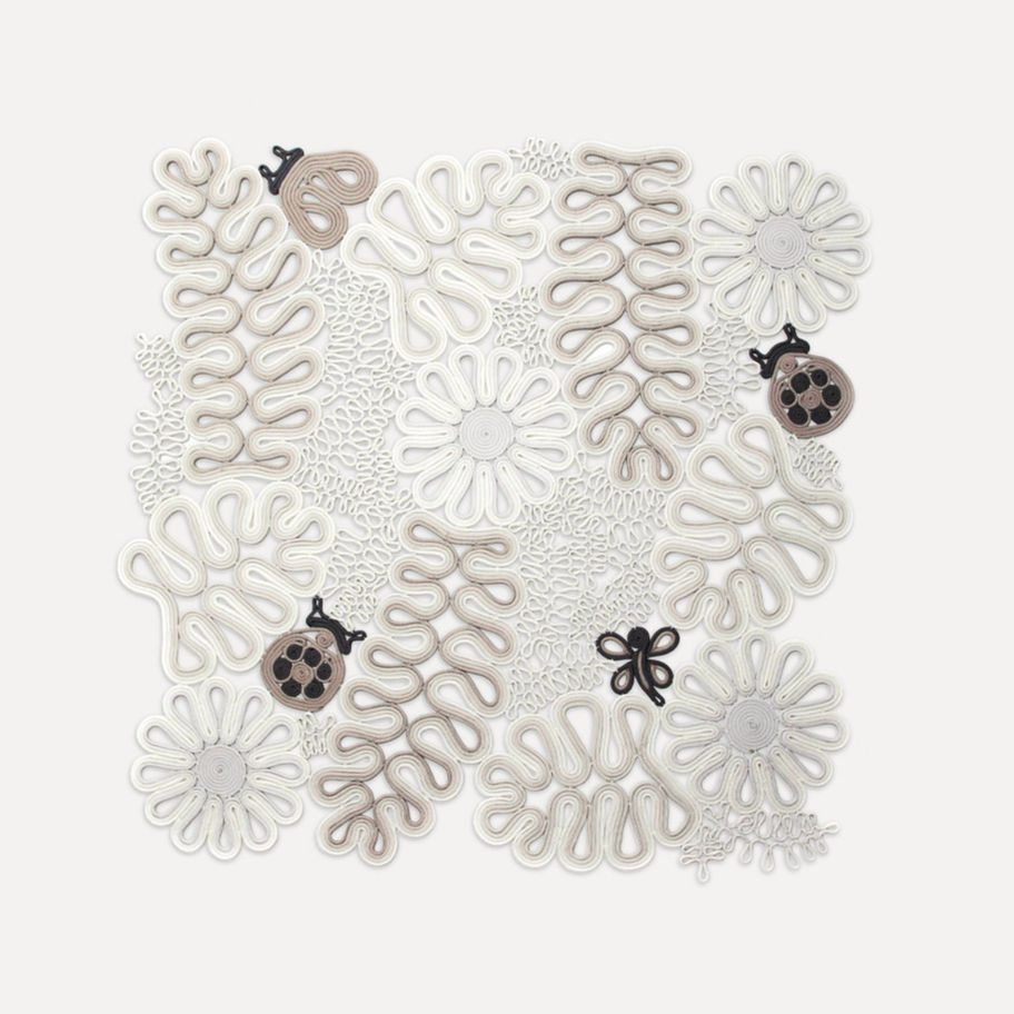 The Ladybird Rug is a luminous tapestry of nature-inspired motifs, meticulously crafted to bring both artistry and lightness to sheltered outdoor environments. Handcrafted from flat Rope cord, each cord is shaped, by hand, into botanical forms like plants and insects, then machine-sewn onto a Kimia fabric backing to create a collage of playful, three-dimensional imagery. The elements are stitched together to form a decorative panel that intentionally allows glimpses of the underlying floor to appear through the spaces between motifs. This composition is so visually rich and artful that the rug doubles beautifully as a wall hanging, blending upholstery with textile art.