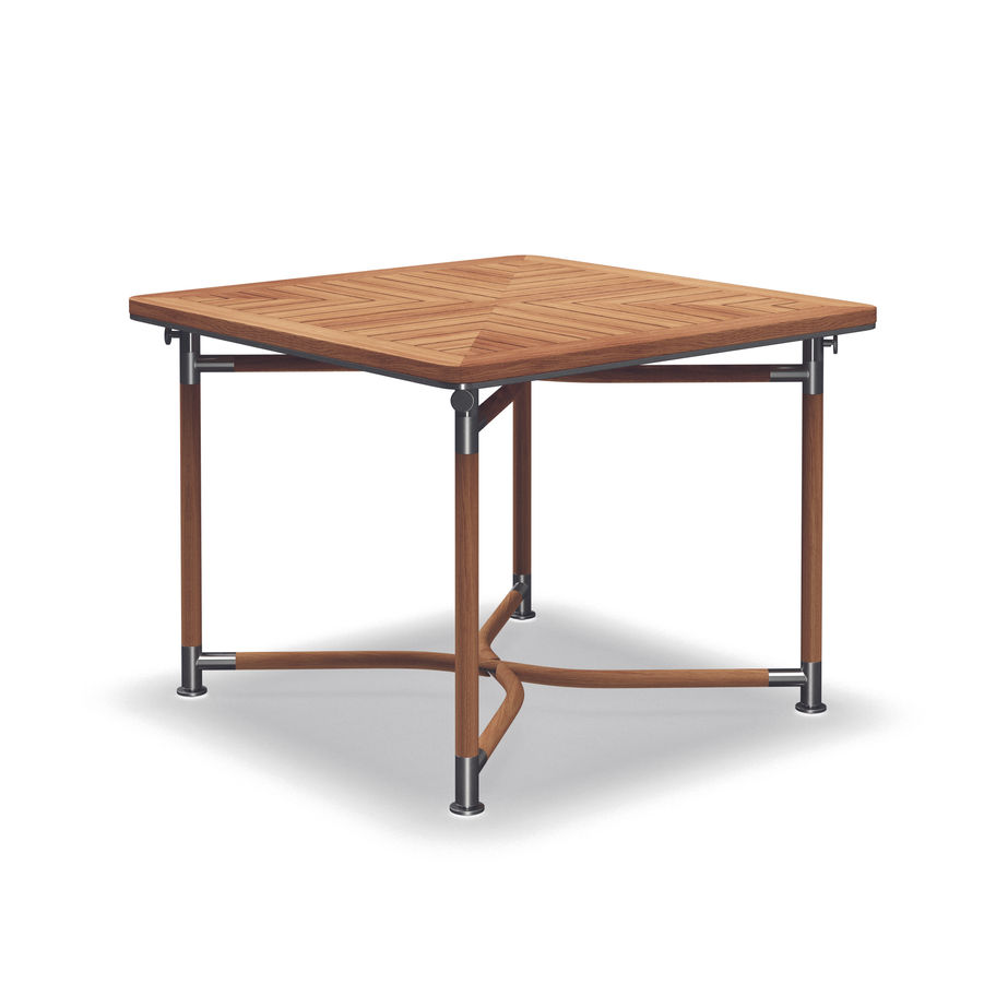 Designed by Glyn Peter Machin, the Navigator table captures vintage travel-inspired allure and contemporary precision. With its teak top and soft stainless steel detail, it offers refined elegance in a practical folding format. Compact yet spacious, it seats four and folds flat for simple storage - making it ideal for outdoor terraces, balconies, or yacht decks. Expertly crafted from sustainably sourced teak and brushed stainless steel, it ages gracefully while retaining timeless character.