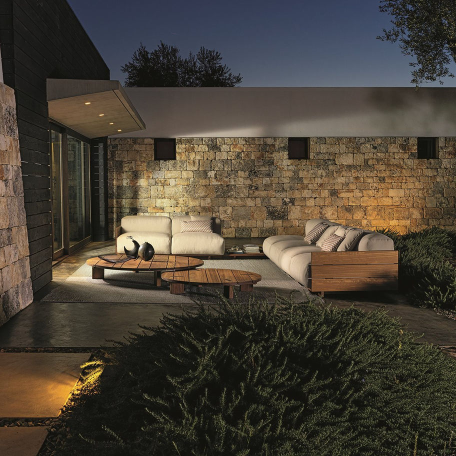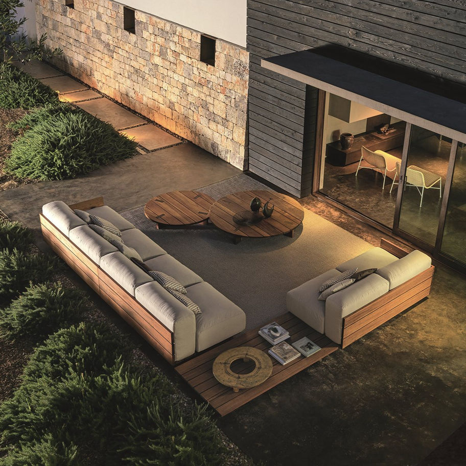 The Pallet Modular Sofa, designed by Piero Lissoni in 2011, is a masterstroke of design that emanates tactile warmth and architectural clarity. Crafted from oil-treated iroko wood, known for its resilience and natural resistance to the elements, the sofa is designed to withstand outdoor conditions. The oil treatment enhances the wood's durability, providing a protective layer that helps maintain its rich hue and texture over time. Embracing a minimalist ethos, the Pallet Sofa features a clean, geometric form characterized by its horizontal slats and robust frame.
