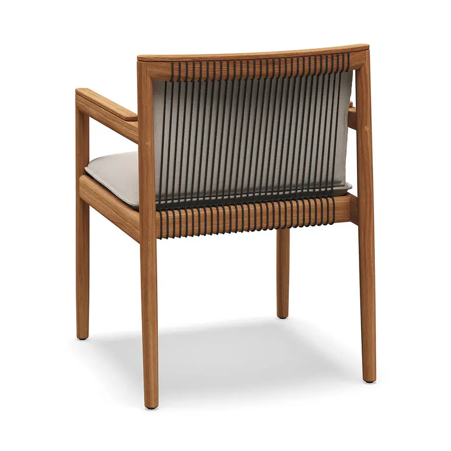The Saranac Dining Chair, designed by Mark Gabbertas, is crafted from sustainably sourced Indonesian teak, renowned for its durability and natural resistance to the elements. The frame is complemented by a Raven-colored woven rope back panel, adding a tactile and visual texture that enhances its modern aesthetic. Designed for outdoor living, the Saranac Dining Chair with Arms is equipped with outdoor fabric seat and back cushions. These cushions are crafted from durable, UV-resistant, and water-repellent materials, ensuring longevity and ease of maintenance.