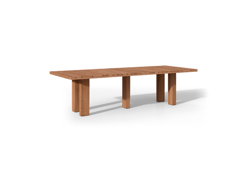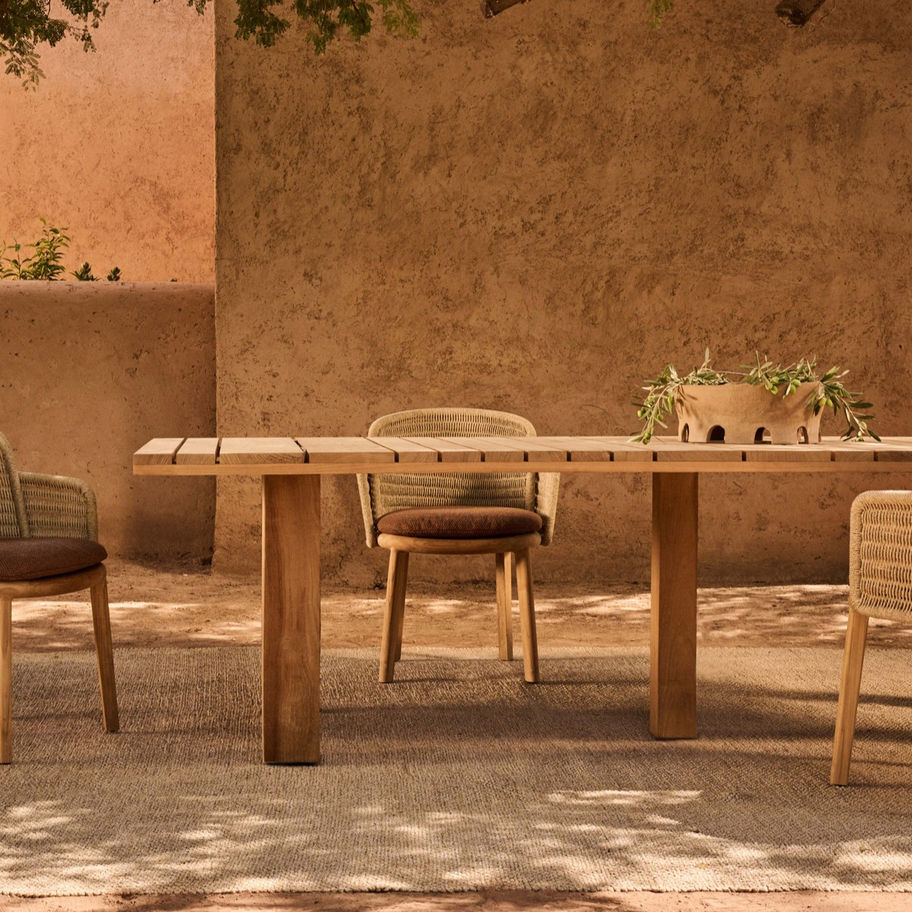 Designed by Christophe Delcourt, the Suro Dining Table pairs architectural teak detailing with refined flexibility. Featuring slatted teak in varying widths and lengths, it adapts to any outdoor scale. Using high-quality brass connectors, multiple tables can combine to create a single continuous surface, ideal for flexible hospitality or residential terraces. Built entirely of FSC-certified teak, Suro delivers sustainable durability and sculptural elegance.