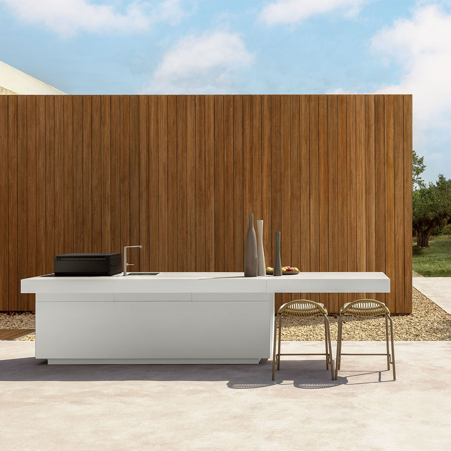 The Tikal three modules base combination is characterised by a magnesit structure painted with black RAL 9004 high temperature textured painting, specific for outdoor. It has 6 swing doors with recessed handles, fast release 125⁰opening and blumotion latch. The available combinable modules are the following: barbeque, sink, induction hub, neutral countertop. As a further option it is possible to add the following accessories: hanging gress top with optional peninsula, wine fridge, ice maker, minibar fridge and lights kit.