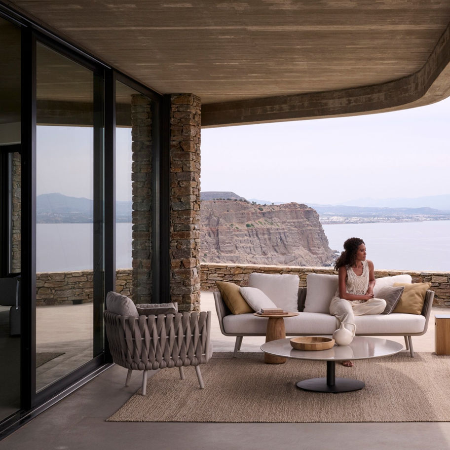 The Tosca collection is simultaneously warm and inviting, stylish and intriguing. Rounded forms, tapered legs and an elegant seating shell in powdercoated stainless steel, upholstered with extra-wide braiding. The material for the braiding is genuinely innovative: foam mousse is encased in a seamless sheath of knitted textilene and polyolefine which makes the material weather-resistant, but also surprisingly soft to the touch.