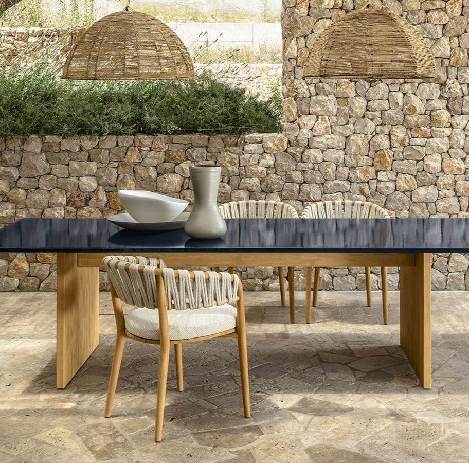 The Venice dining armchair, inspired by the famous lagoon city, is the perfect solution to enhance your living area in the garden. The solid teak wood frame embraces the wide and comfortable seat. The fabric of the cushions and the rope weave that wraps around the back, recall the classic nautical style and make the exterior refined and elegant.