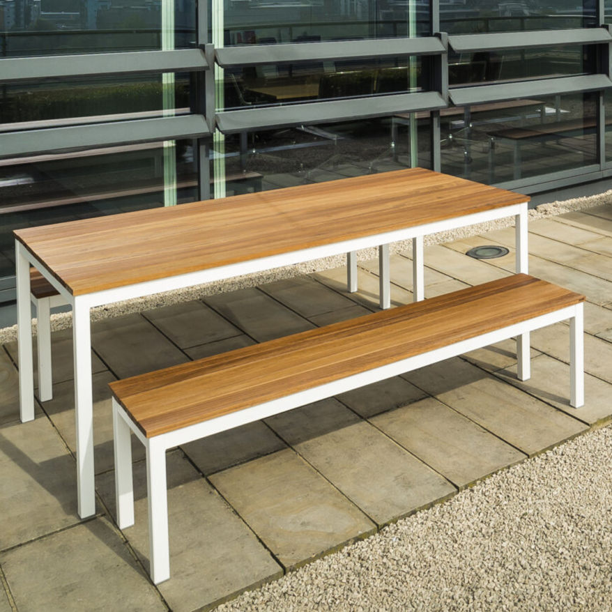Made in the UK, the Wave Bench is an elegantly crafted outdoor dining ensemble that strikes a perfect balance between sculptural artistry and durable performance. The signature aesthetic lies in its gently undulating “wave” motif of FSC-certified Iroko slats: this curved timber top shimmers with texture and warmth, and each table can be extended in length by repeating the wave pattern without sacrifice to its seamless flow. Set upon a choice of robust bases; stainless steel, galvanised steel, or powder-coated steel in a variety of colours, the structure has been engineered to endure British weather while staying true to its refined character. The seat top itself is not just beautiful but resilient: Iroko naturally contains oils that resist rot and decay even without constant treatment, and replacement slats are available, reflecting the product’s thoughtful build and long-life design.