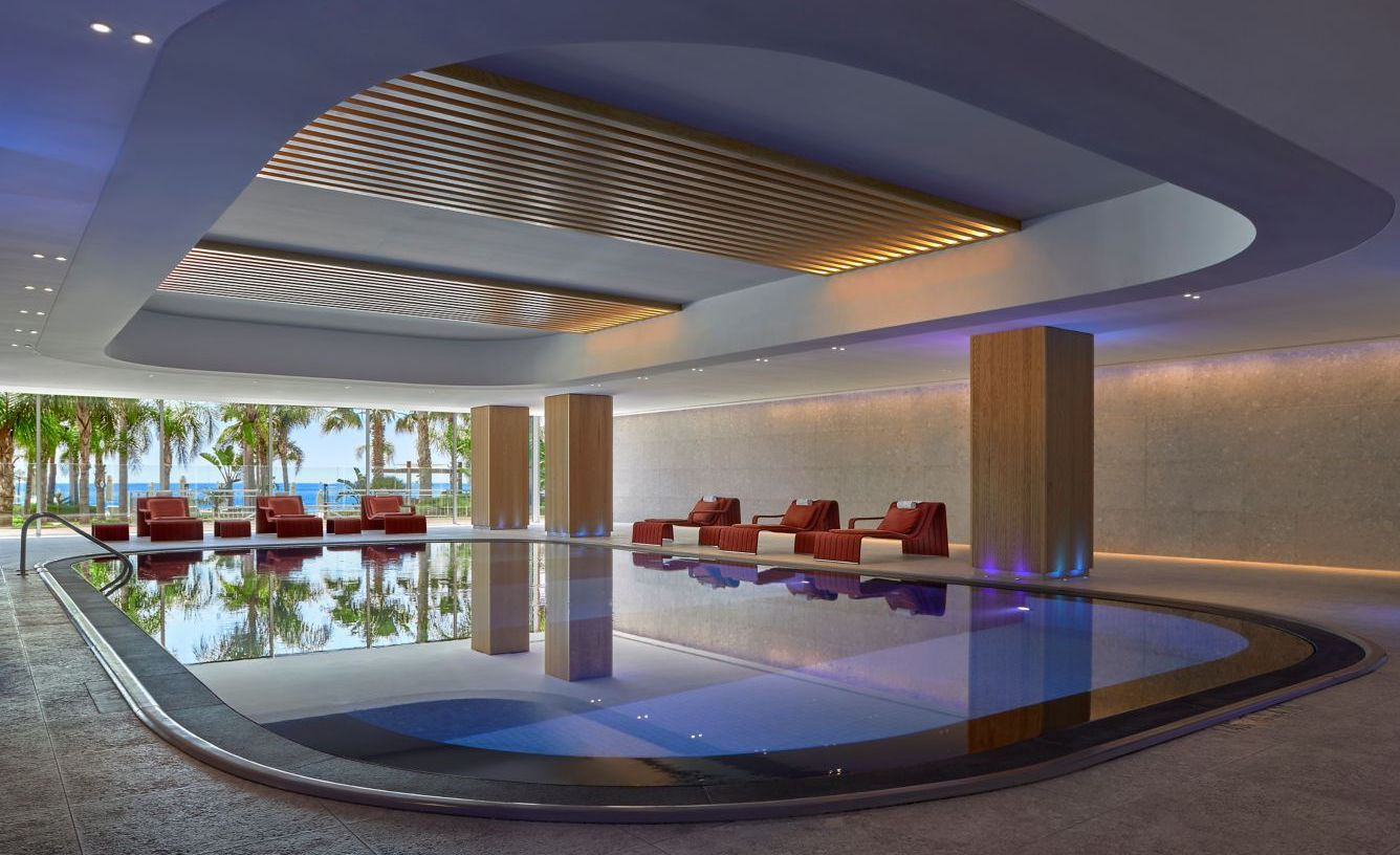Furnished with the Frame collection of chairs and side tables by Paola Lenti, the design introduces a striking pop of bright red that contrasts beautifully with the cool blues of the indoor spa. This bold colour choice adds vibrancy and energy to the serene environment, creating a visually engaging and inviting space.
